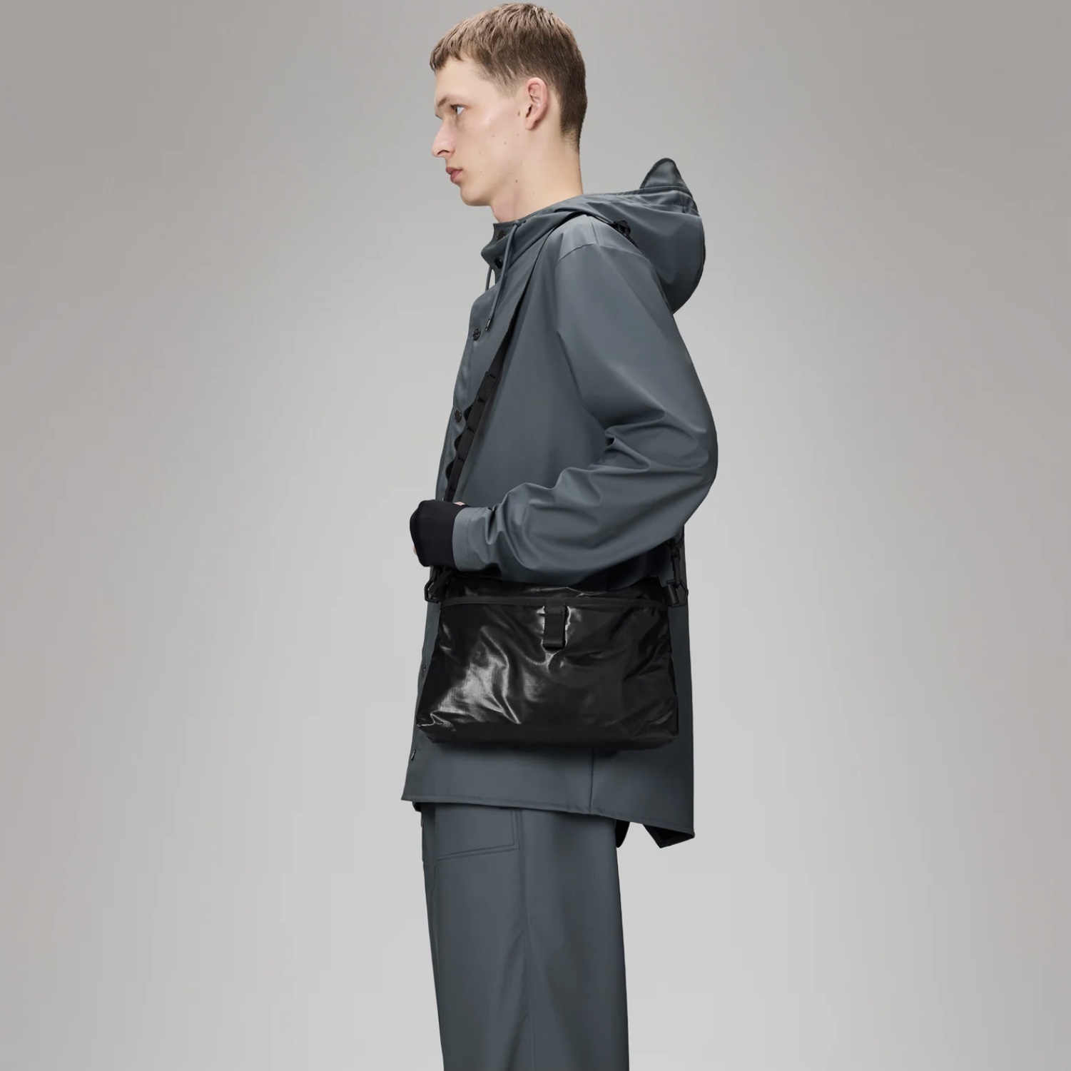 La Sibu Musette Bag è realizzata in poliestere tecnico Rains con un rivestimento in TPU impermeabile. Il design è elegante, leggero e particolarmente resistente.